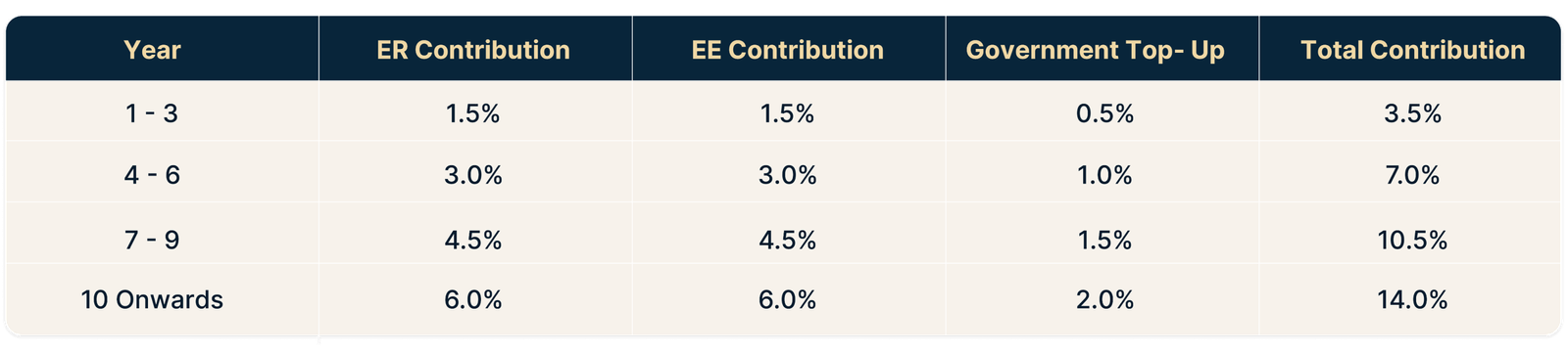 Contributions start at 1.5% of gross taxable earnings and increase to 6% over a 10-year period, matching employee contributions.